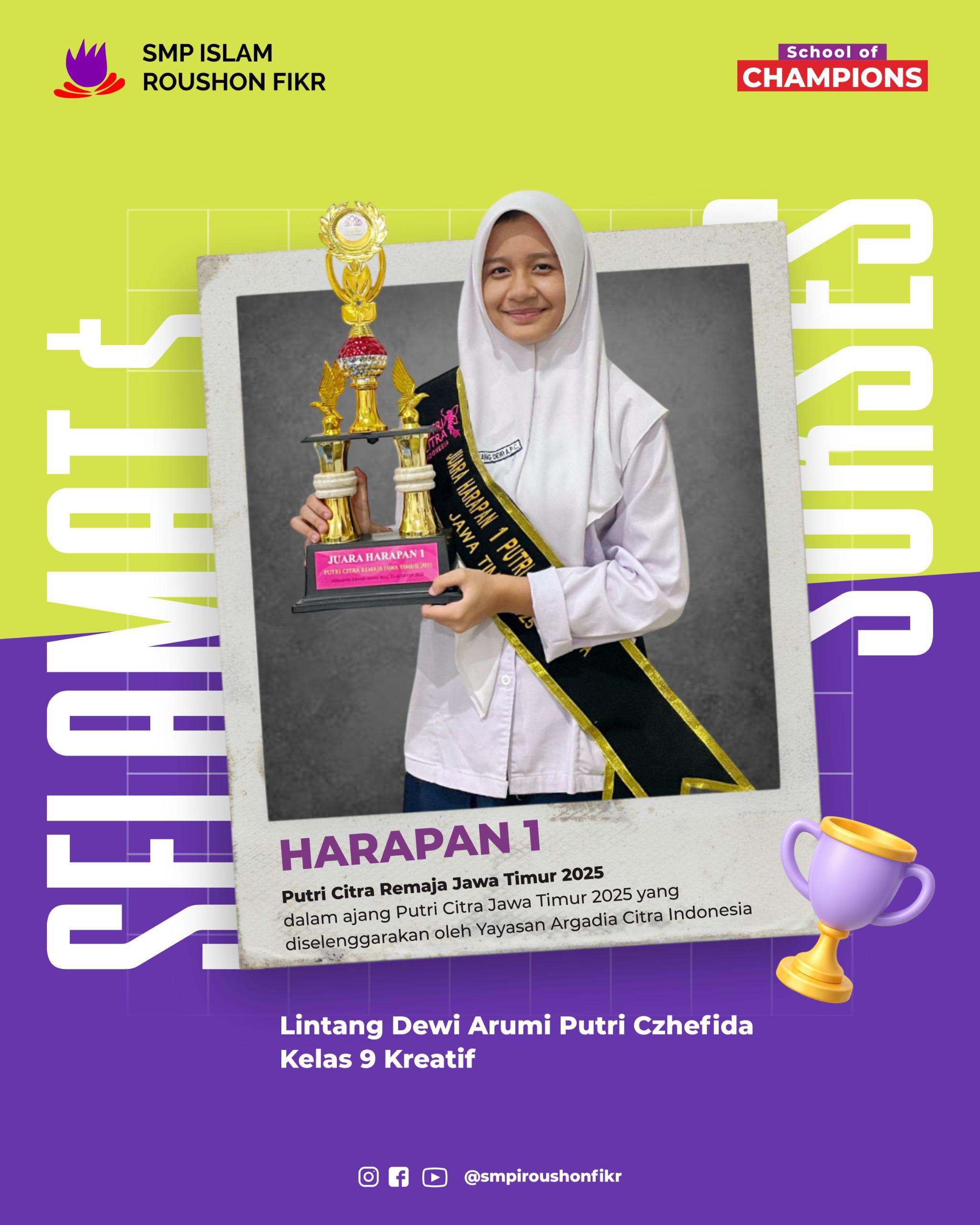 Kabar membanggakan hadir dari ajang pemilihan Putri Citra Remaja Jawa Timur 2025 yang diselenggarakan oleh Yayasan Argadia Citra Indonesia. Lintang Dewi Arumi Putri Czhefida, siswi kelas 9 SMP Islam Roushon Fikr Jombang, berhasil meraih gelar Juara Harapan 1. Kompetisi ini …