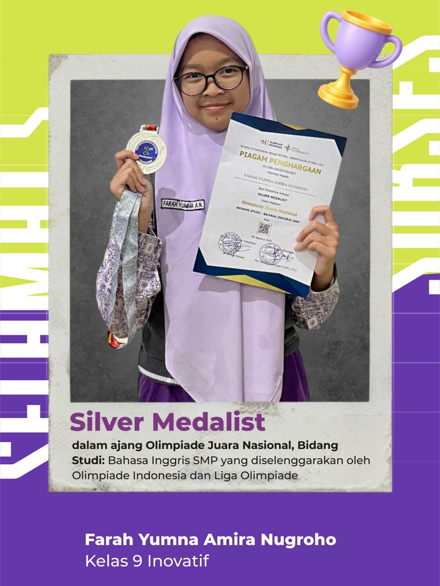 Selamat dan sukses kami sampaikan kepada Ananda Farah Yumna Amira Nugroho dari Kelas 9 Inovatif yang telah berhasil meraih Silver Medal pada Olimpiade Juara Nasional bidang Bahasa Inggris tingkat SMP yang diselenggarakan oleh Olimpiade Indonesia bekerja sama dengan Liga Olimpiade. …